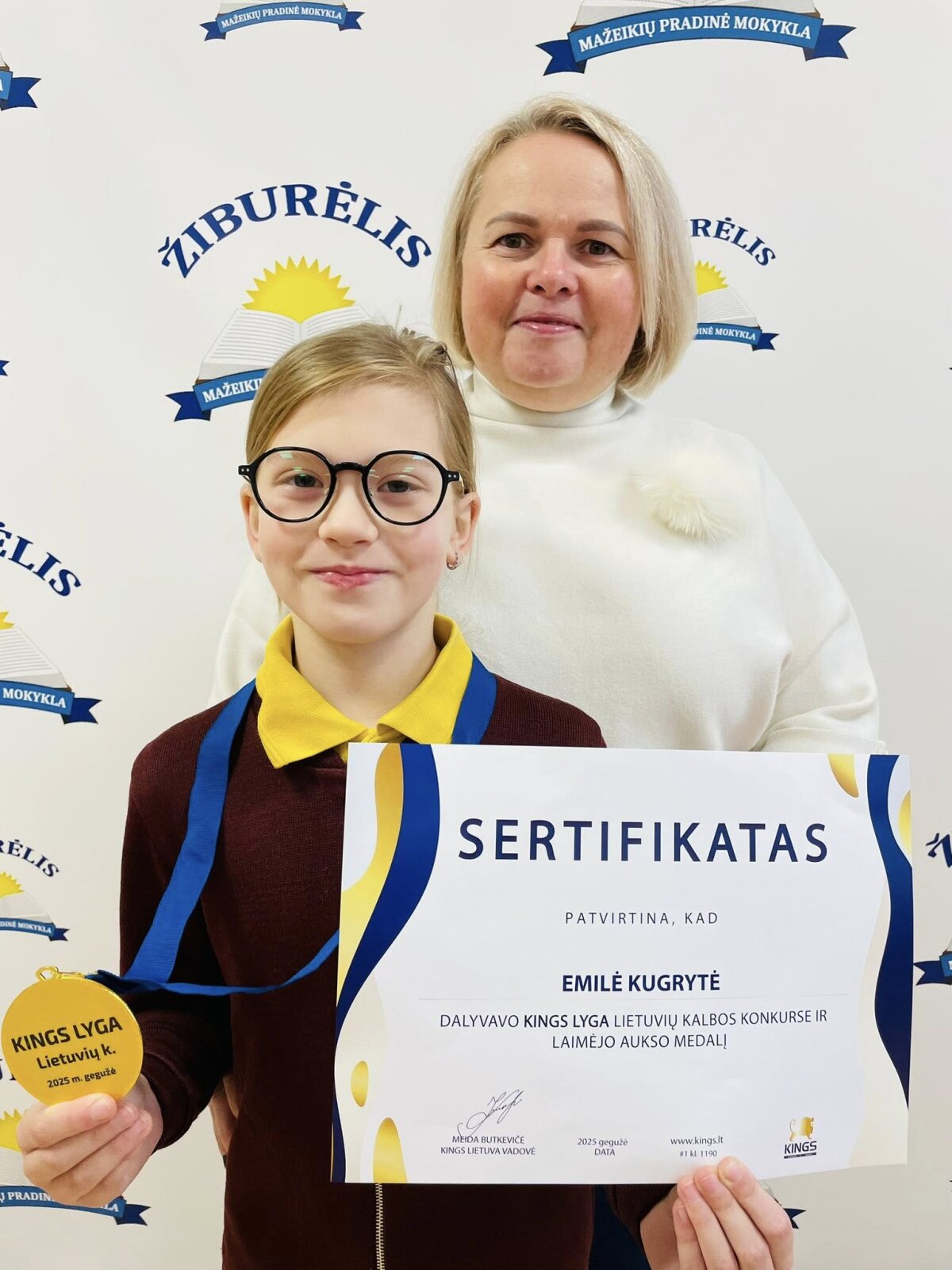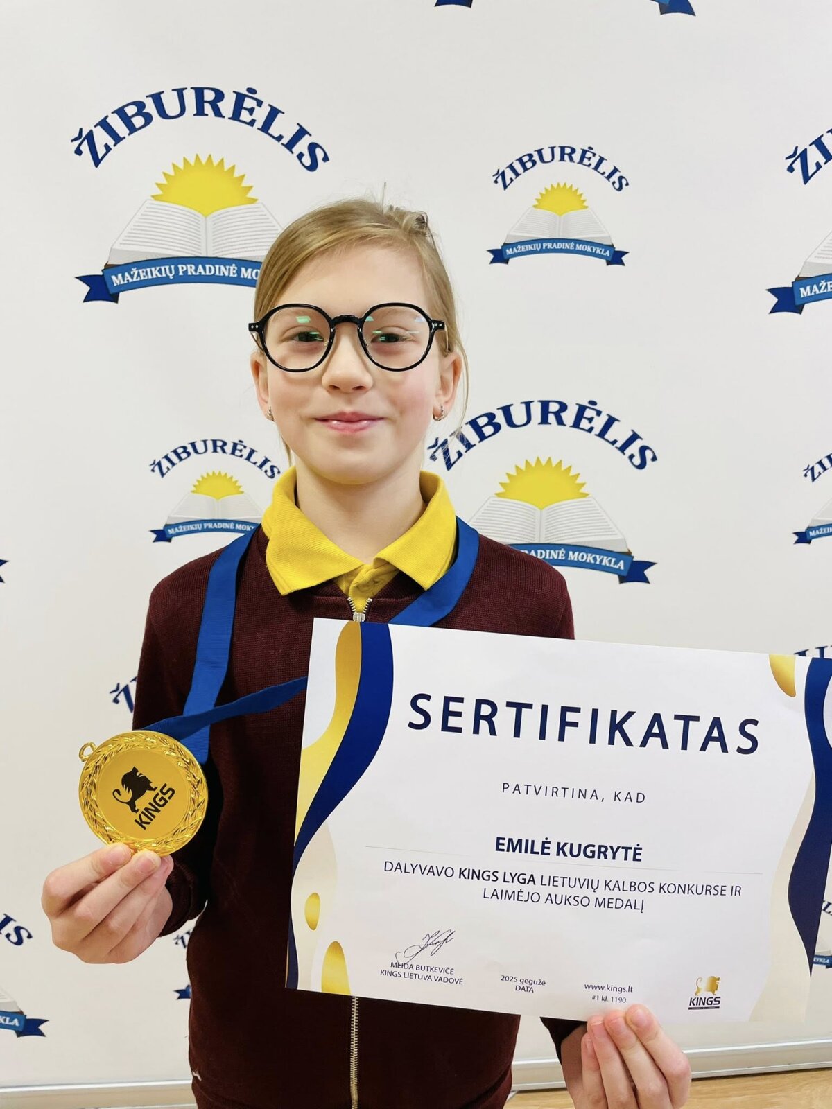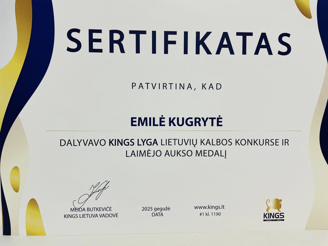 2a klasės mokinė EMILĖ KUGRYTĖ dalyvavo „Kings Lyga“ lietuvių kalbos konkurse ir pagal pasiektą žinių lygį laimėjo AUKSO medalį. Laimėjimą patvirtina gautas sertifikatas!