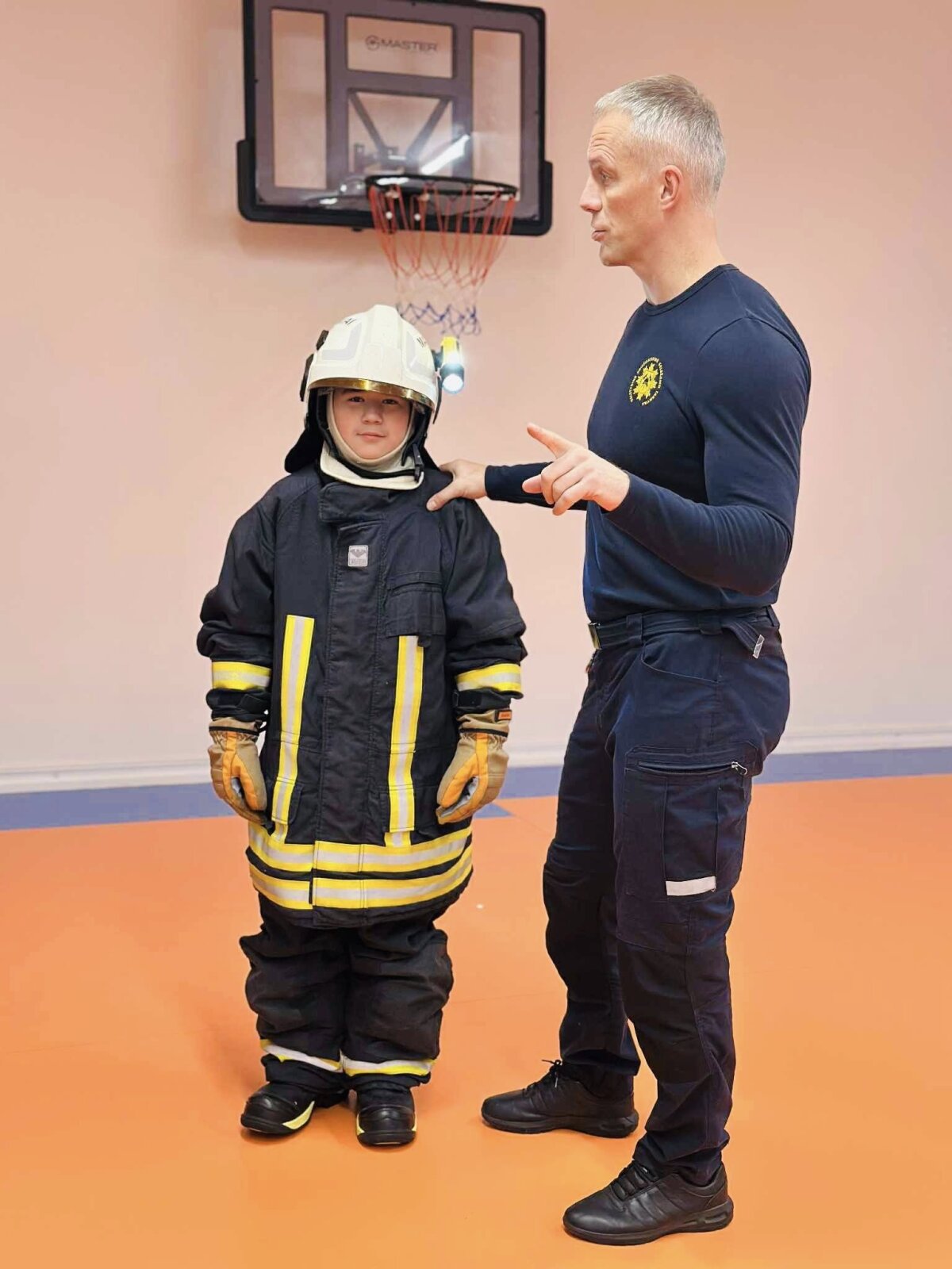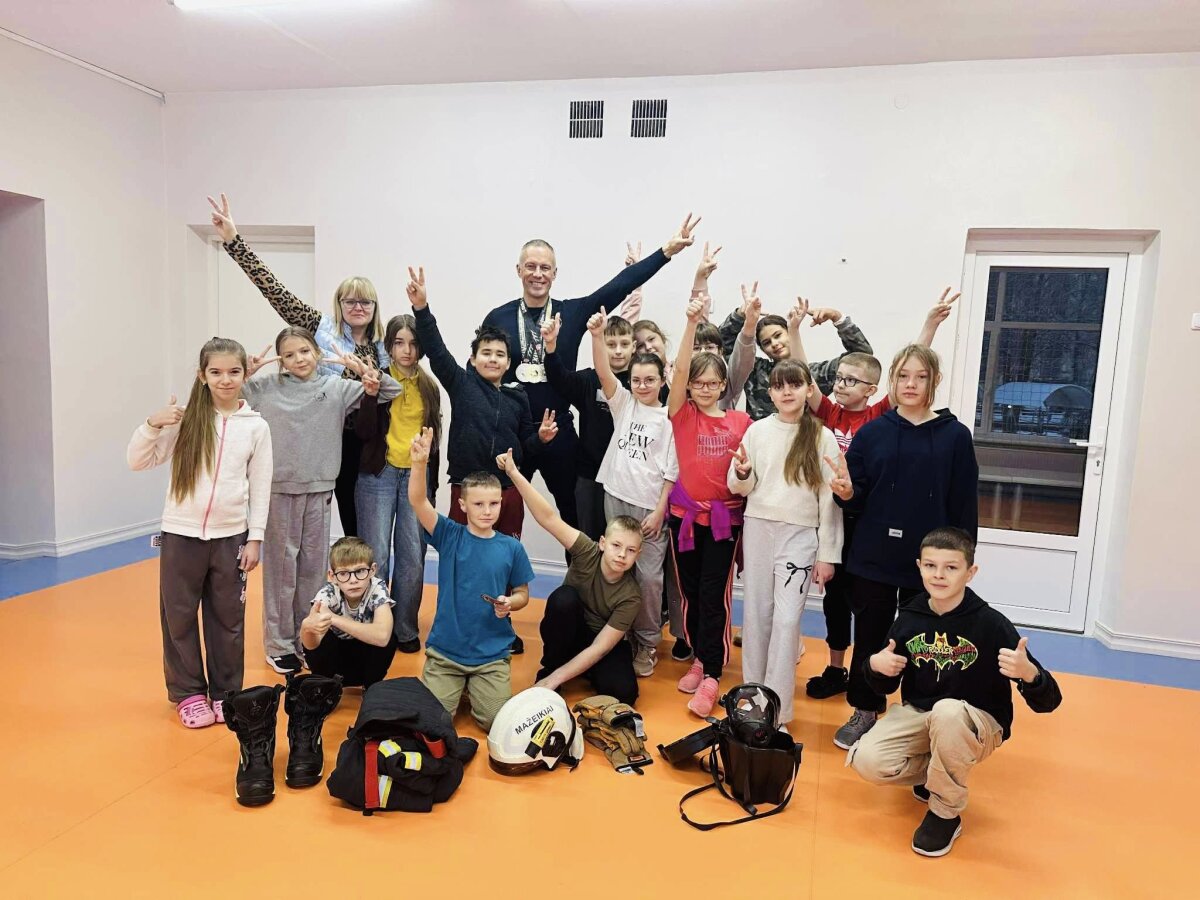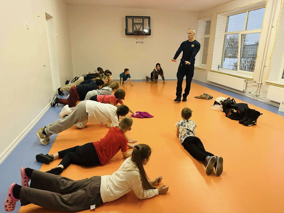 Šiandien 4b klasės mokiniai ir jų mokytoja Indrė Vitkevičienė turėjo išskirtinę fizinio ugdymo pamoką, kurią pravedė gaisrininkas–gelbėtojas ir treneris Renatas Viskontas.